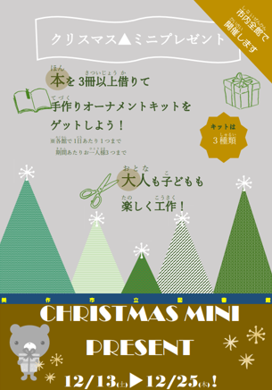 本を3冊以上借りると、クリスマスにちなんだ手作りオーナメントキットがもらえます♪